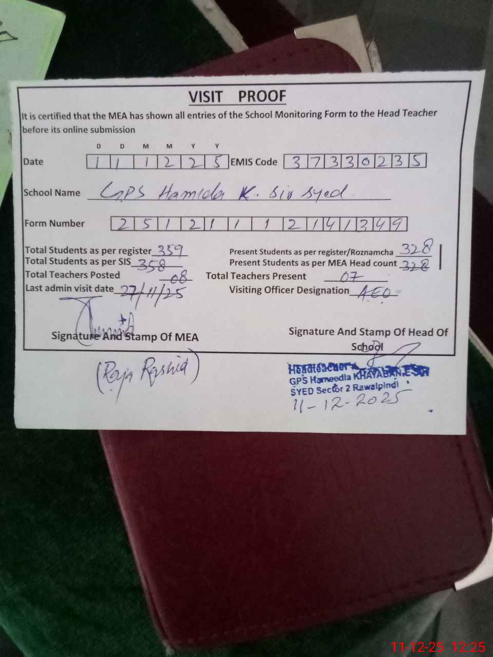 | Attendance Register | Head Teacher | MEA with School | Visit Proof |