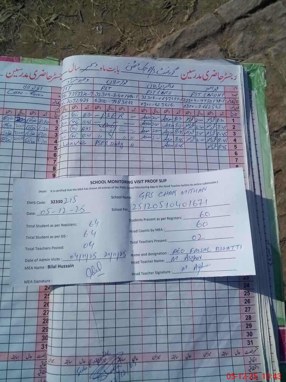 | Attendance Register | Head Teacher | MEA with School | Visit Proof |