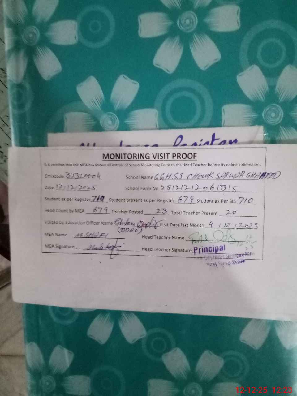 | Attendance Register | Head Teacher | MEA with School | Visit Proof |