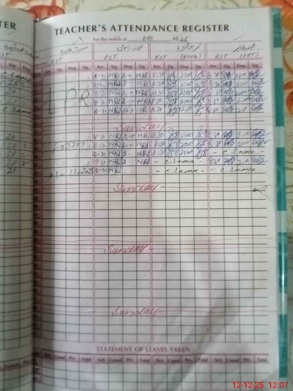 | CNIC | Full Name | Designation | R/C | Absence During Last Calender Month |