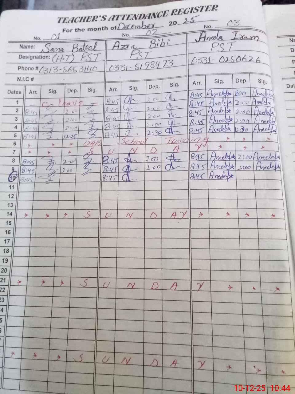 | CNIC | Full Name | Designation | R/C | Absence During Last Calender Month |