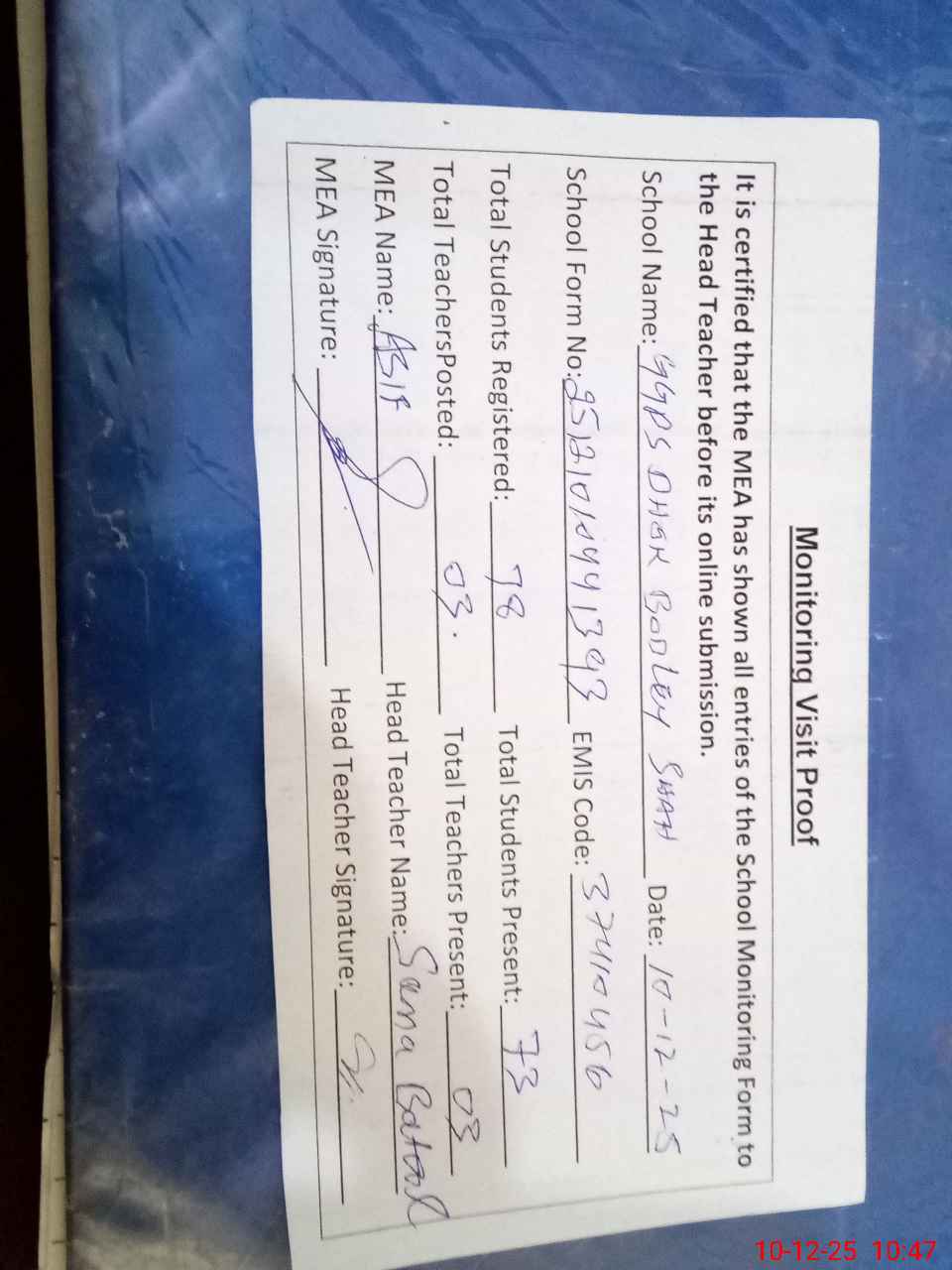 | Attendance Register | Head Teacher | MEA with School | Visit Proof |