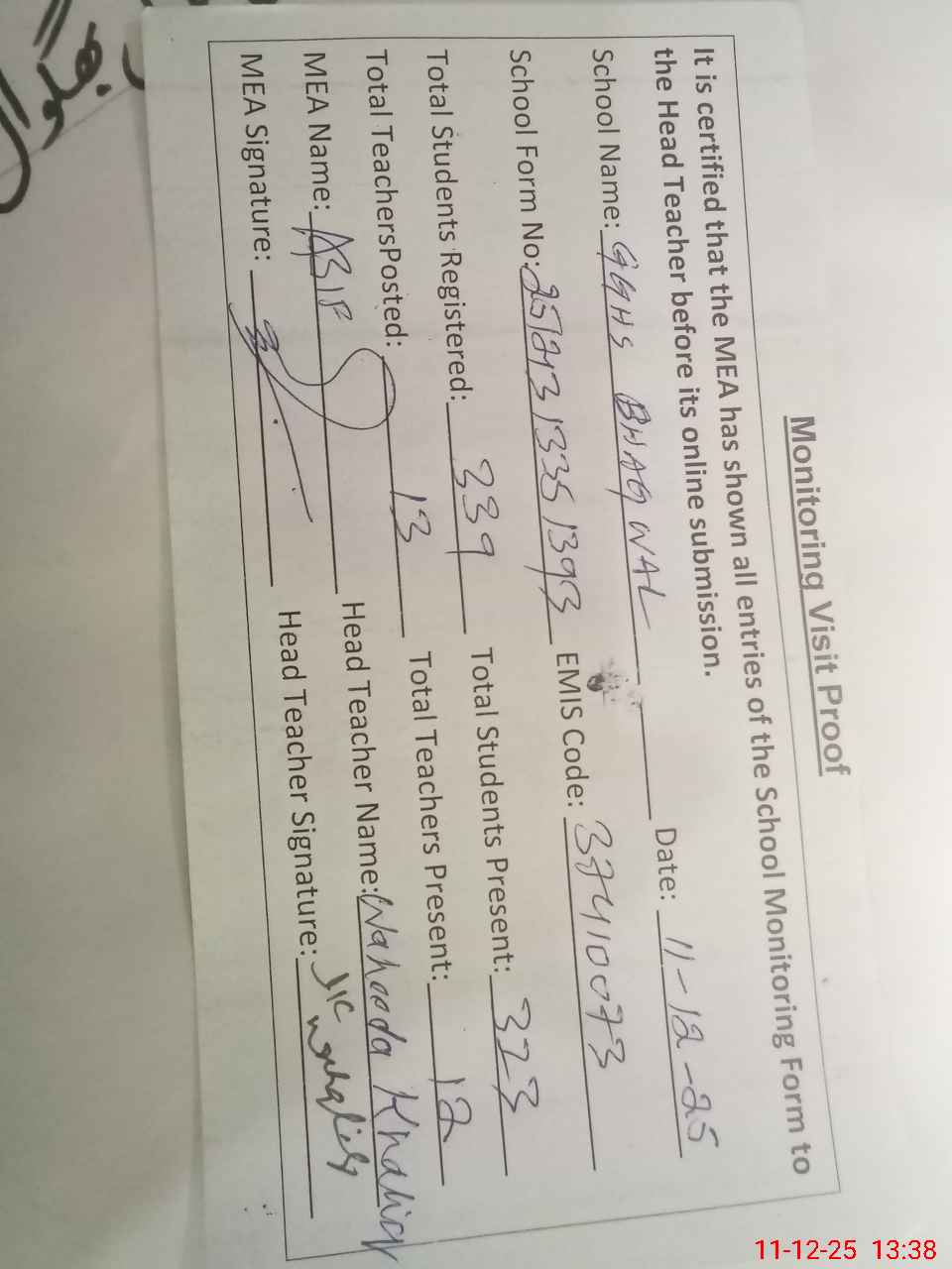 | Attendance Register | Head Teacher | MEA with School | Visit Proof |