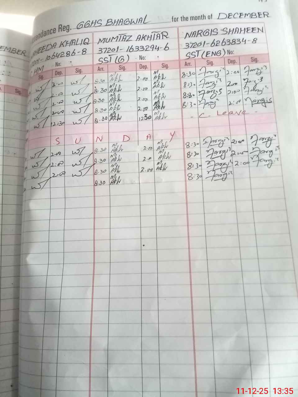 | CNIC | Full Name | Designation | R/C | Absence During Last Calender Month |