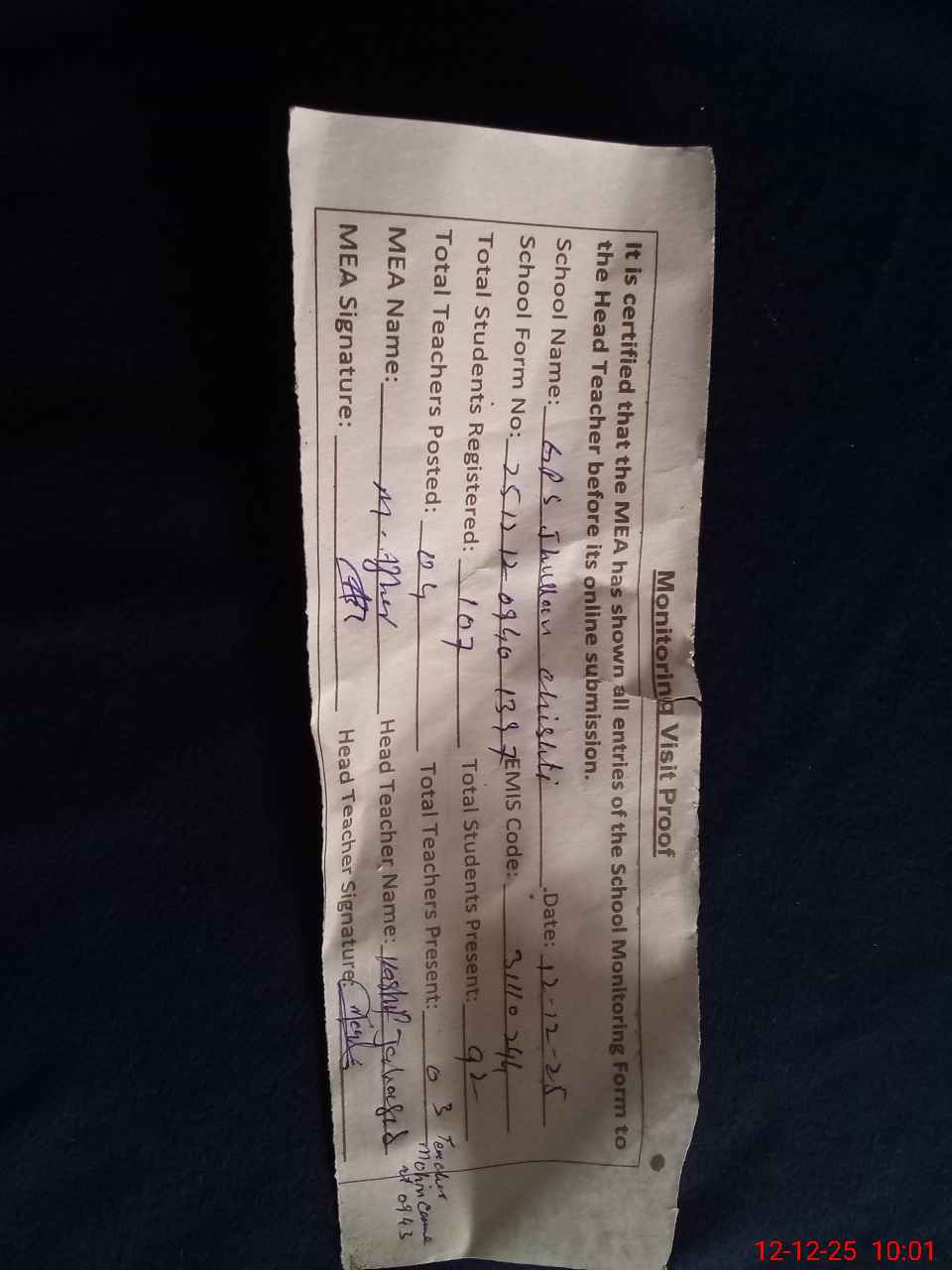| Attendance Register | Head Teacher | MEA with School | Visit Proof |