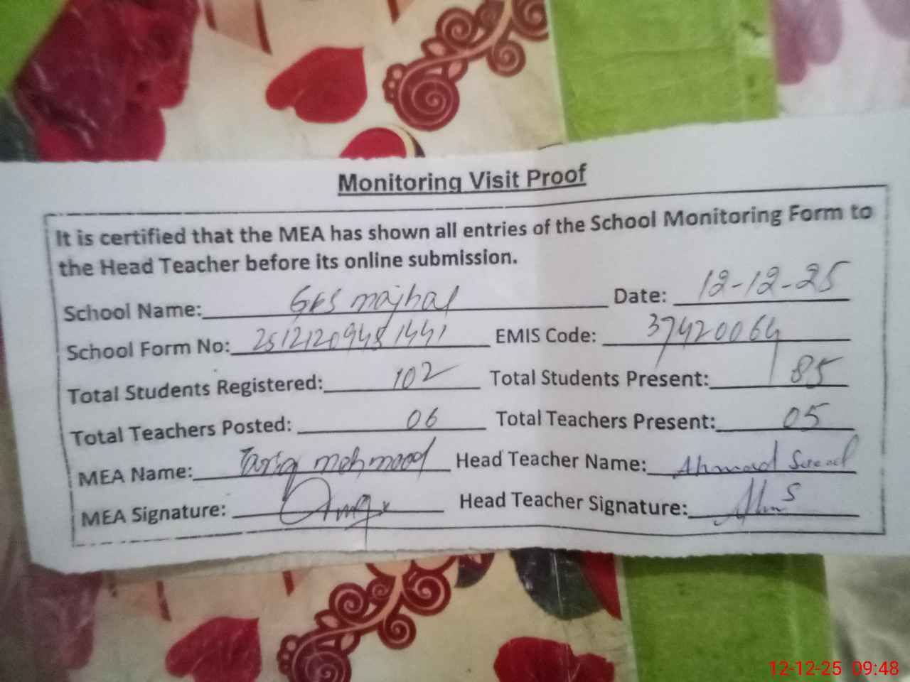 | Certified that this School was Inspected by the Undersigned MEA/DMO Today and the Information Stated Above is as Per Record. | |||||