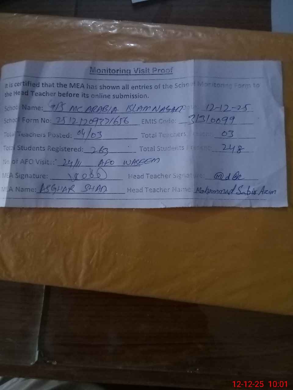 | Monitoring Date: 12-12-2025 | Start Time: 12-12-2025 09:32 AM | End Time: 12-12-2025 10:01 AM | Name of MEA: Mu**** As**** Sh**** | |