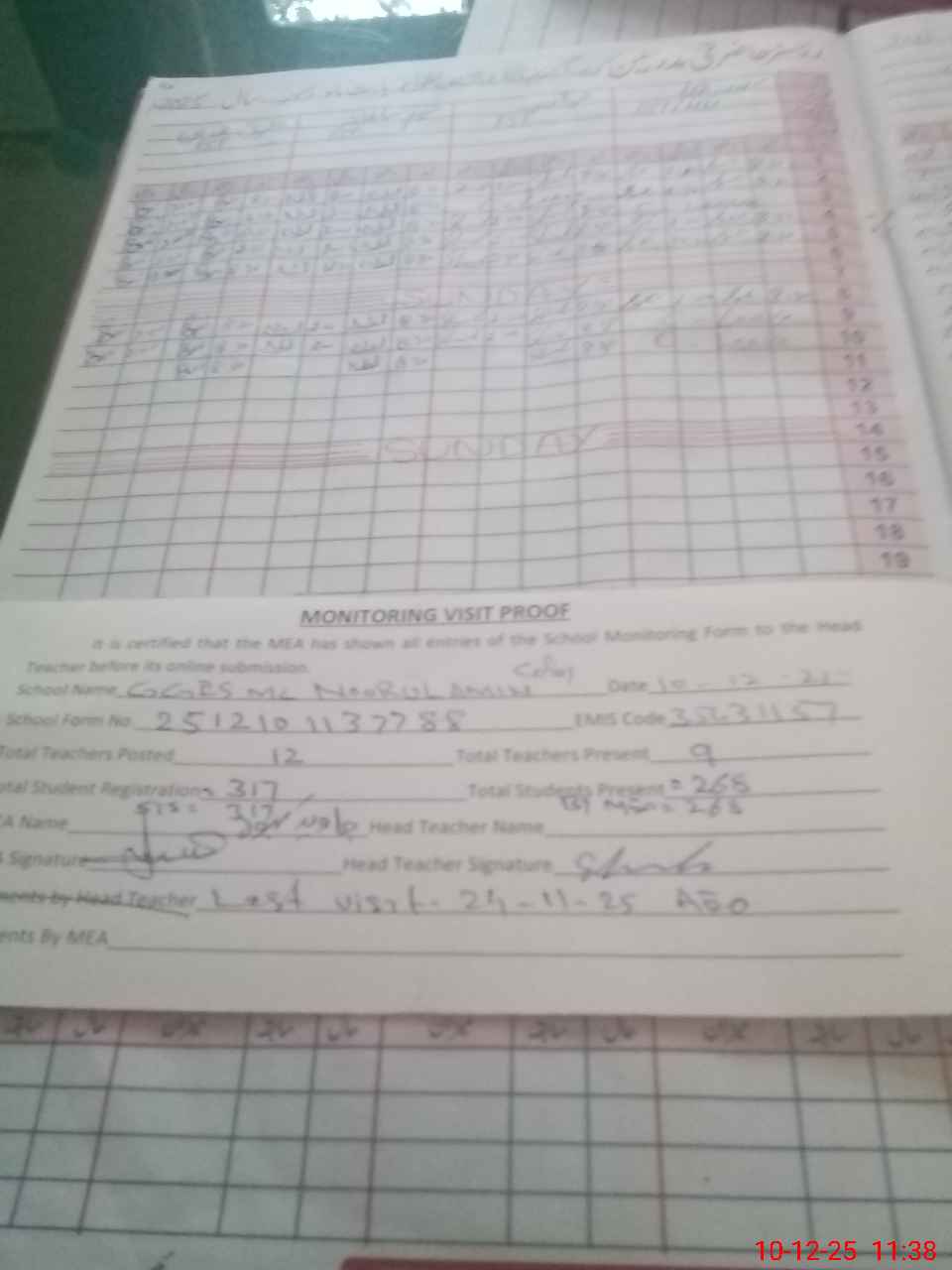 | Attendance Register | Head Teacher | MEA with School | Visit Proof |