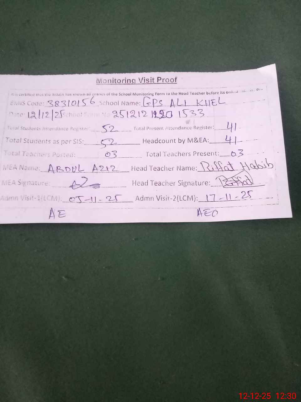 | EMIS Code: 38310156 | Name of School: GPS ALI KHEL WANDHA SHAHBAZ KHEL | |||
