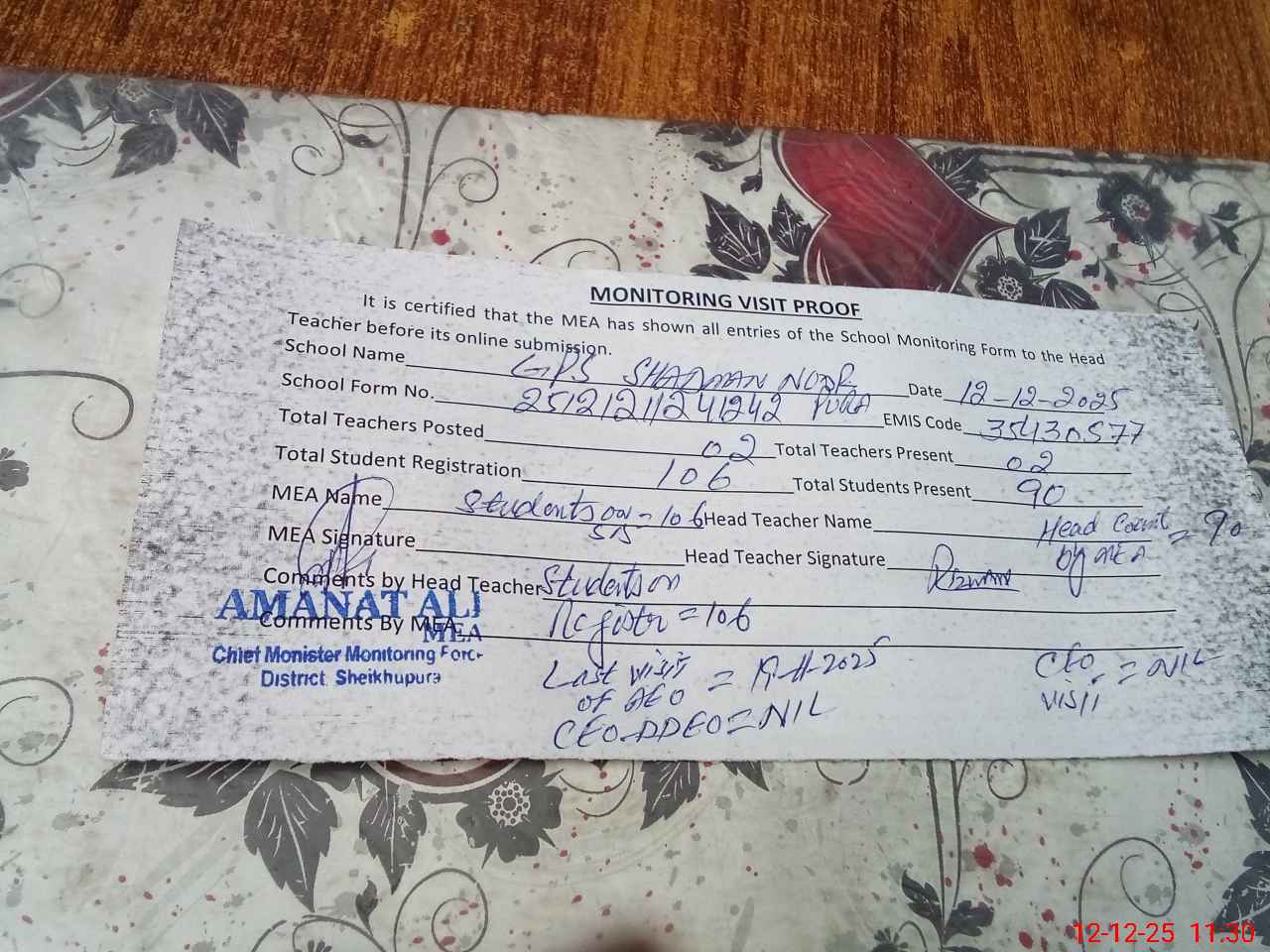 | EMIS Code: 35430577 | Name of School: GPS SHADMAN NOOR PURA | |||