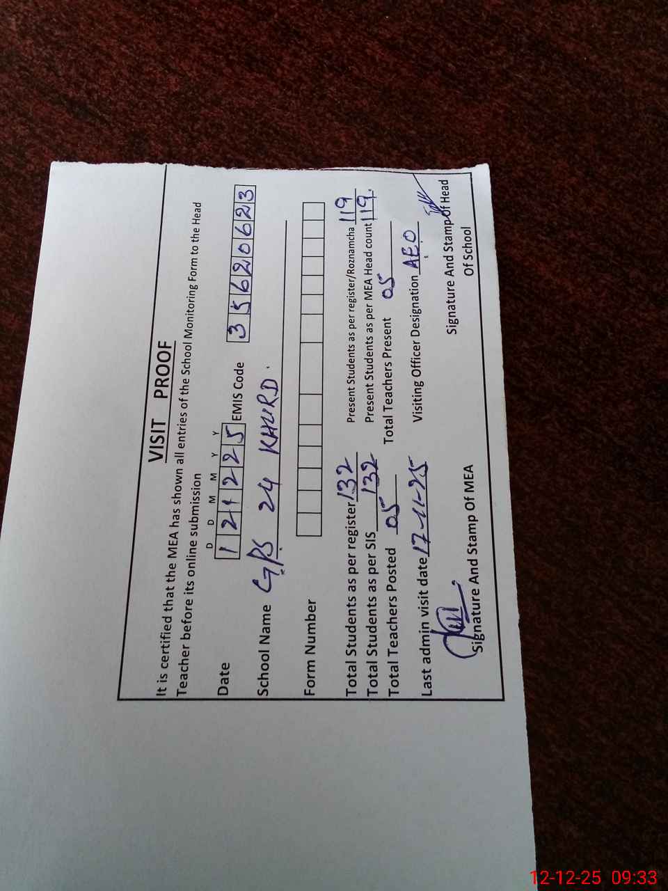| Attendance Register | Head Teacher | MEA with School | Visit Proof |