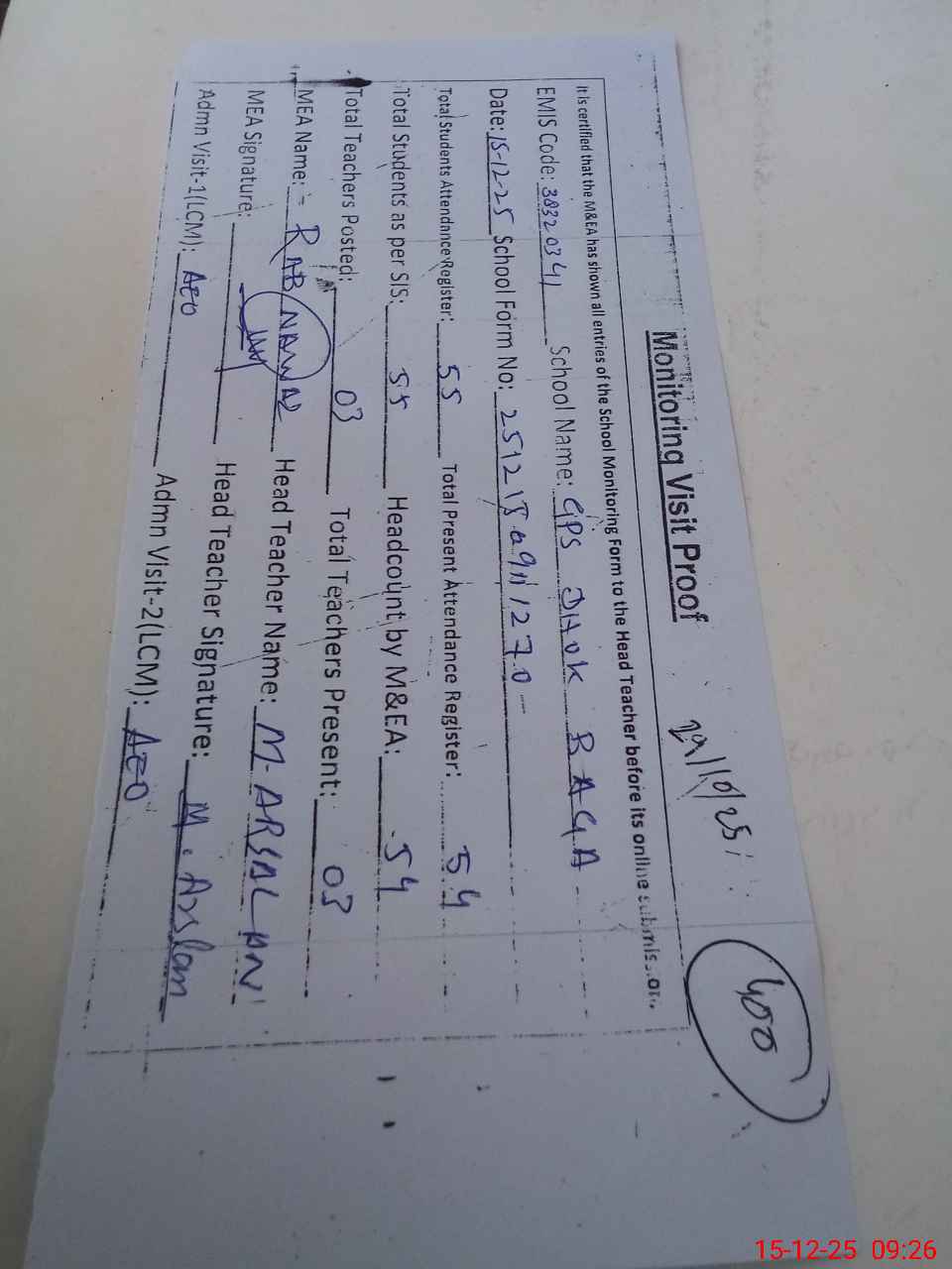 | Attendance Register | Head Teacher | MEA with School | Visit Proof |
