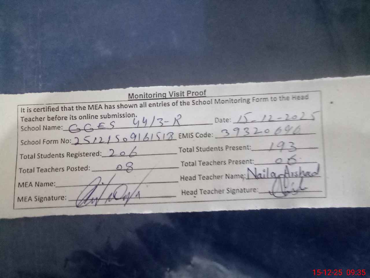 | Attendance Register | Head Teacher | MEA with School | Visit Proof |