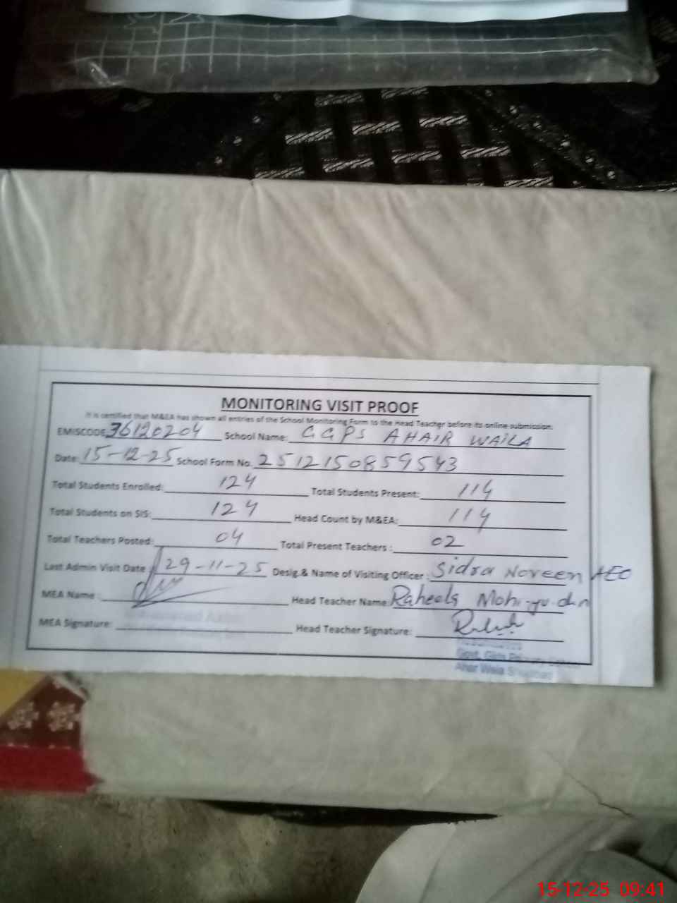 | Attendance Register | Head Teacher | MEA with School | Visit Proof |