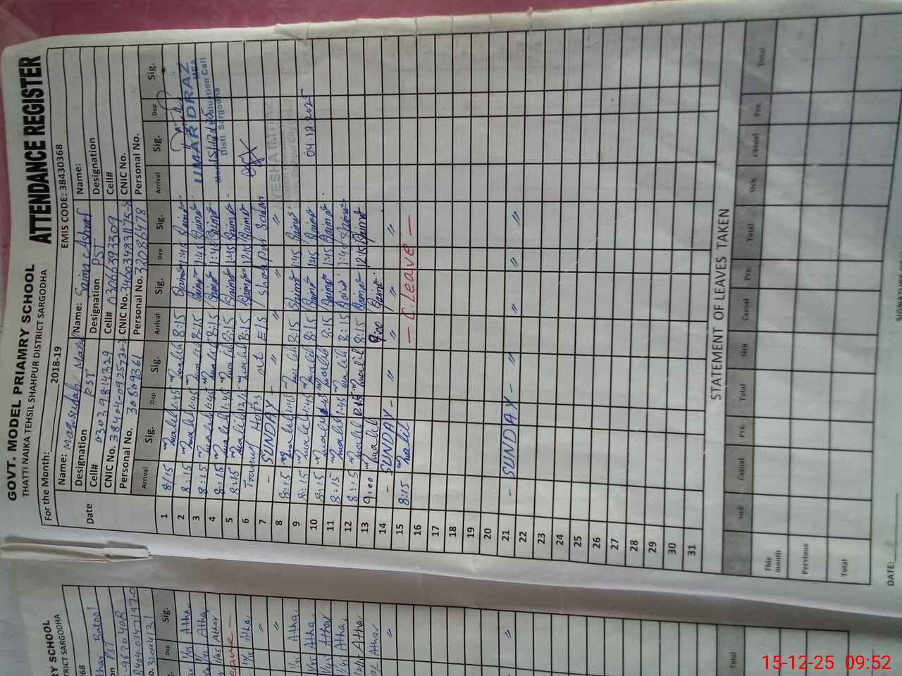 | Name: SA**** AH**** Designation: (School Headmaster's/Headmistress's) PST Phone/Cell Number: 03**** |