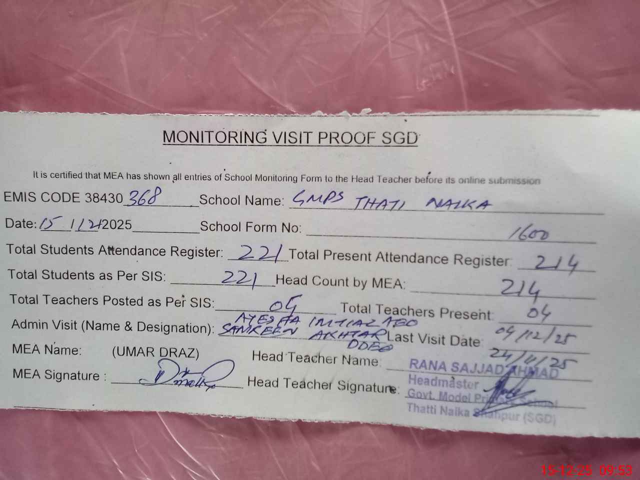 | Attendance Register | Head Teacher | MEA with School | Visit Proof |