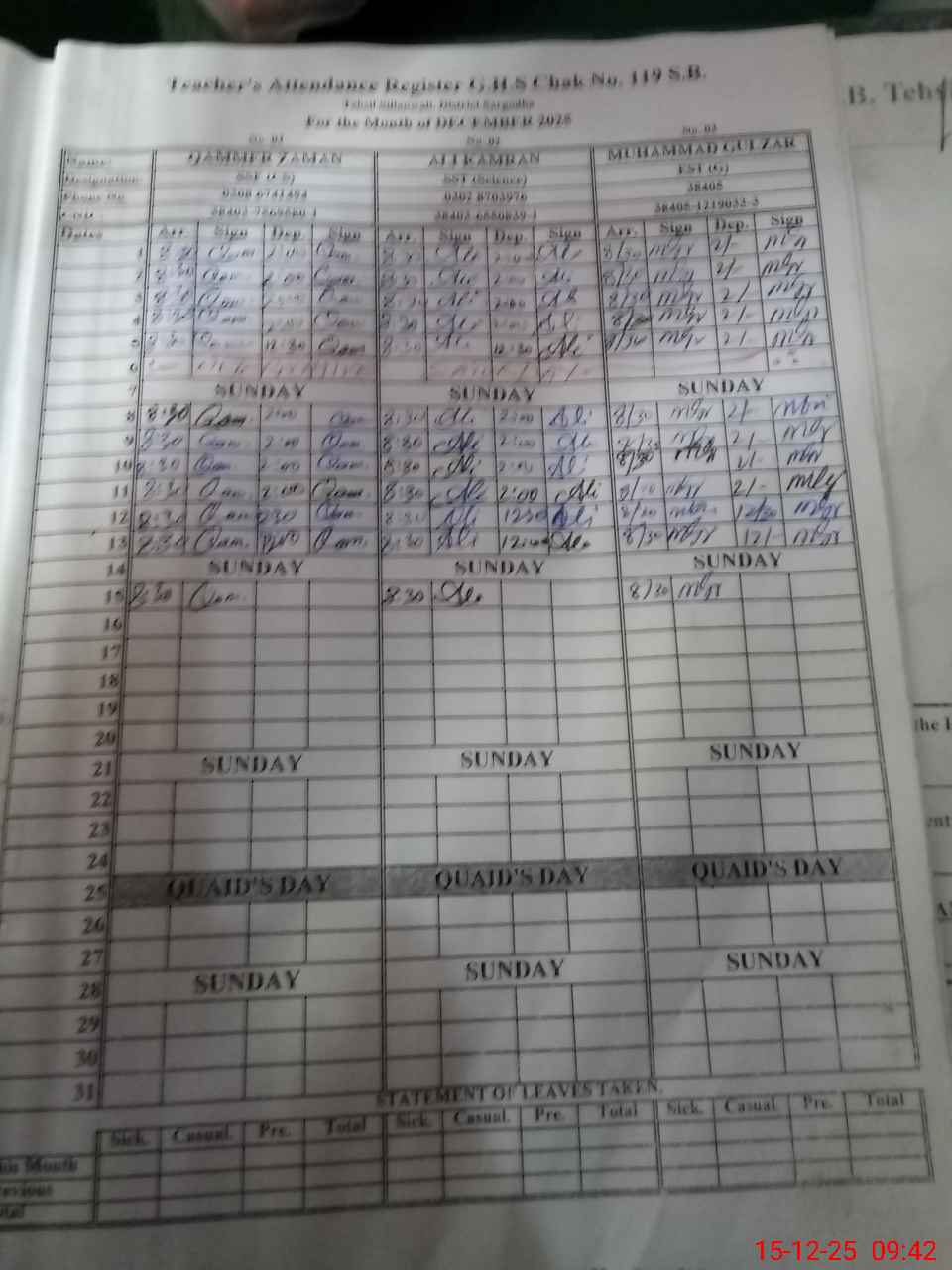 | CNIC | Full Name | Designation | R/C | Absence During Last Calender Month |