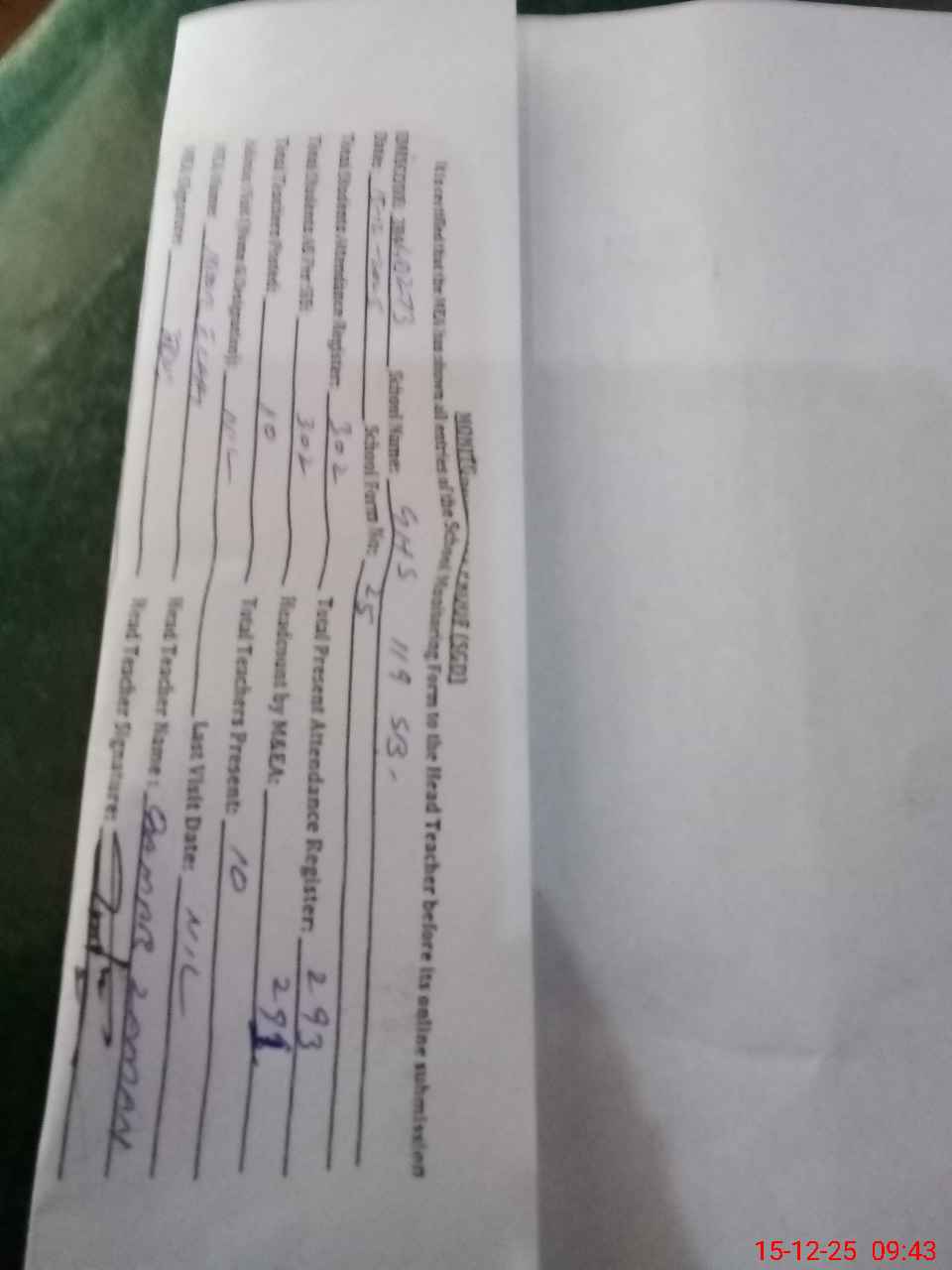 | Attendance Register | Head Teacher | MEA with School | Visit Proof |