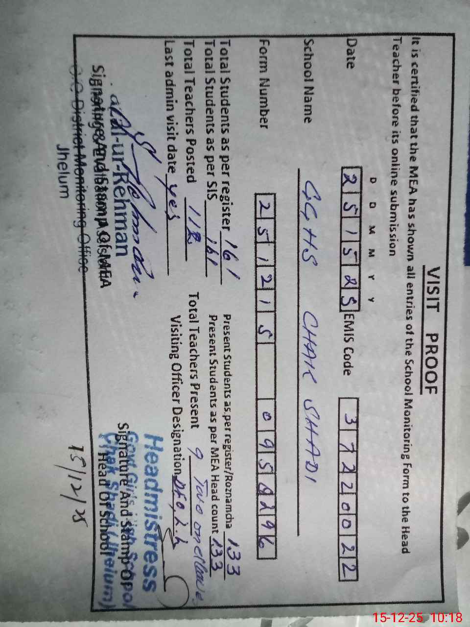 | EMIS Code: 37220022 | Name of School: GGHS CHAK SHADI | |||