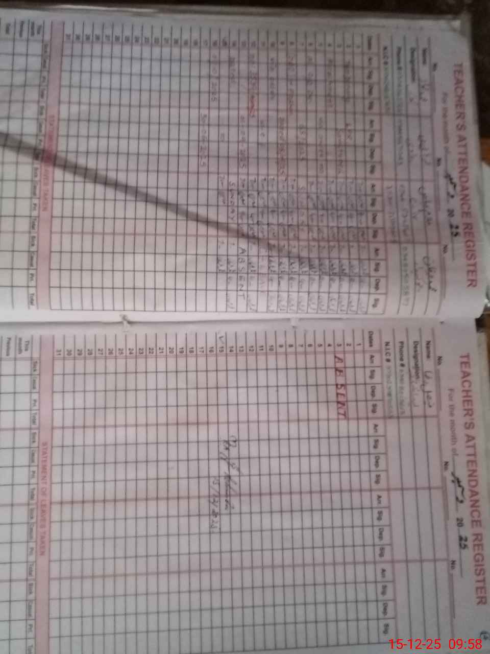 | CNIC | Full Name | Designation | R/C | Absence During Last Calender Month |