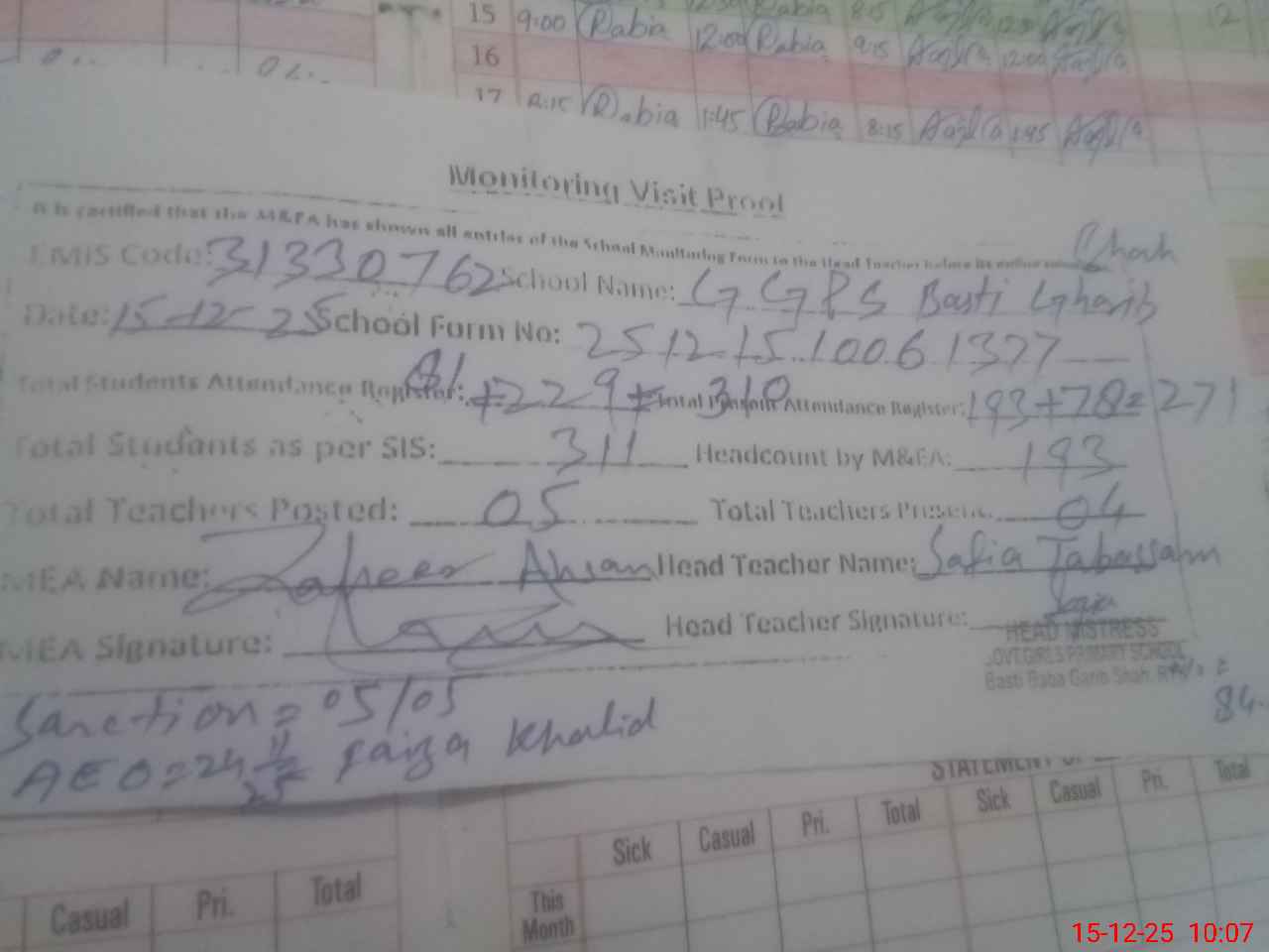 | Monitoring Date: 15-12-2025 | Start Time: 15-12-2025 09:20 AM | End Time: 15-12-2025 10:20 AM | Name of MEA: Za**** Ah**** | |