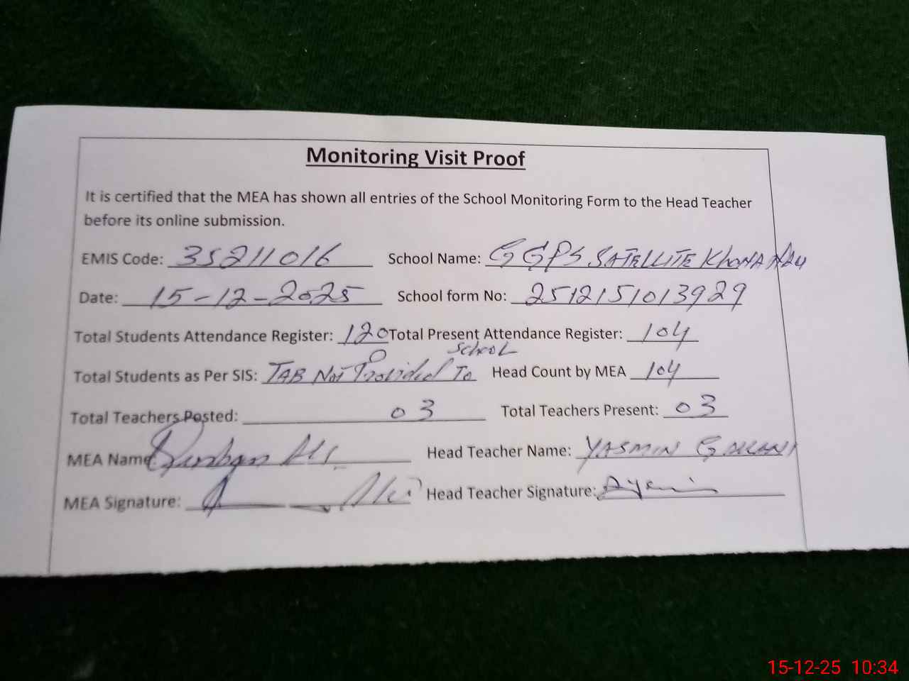 | Remarks (Use Separate Page if Required): 1-.NSB fund not provided to the school this school established in this building Estimated wef 2018 before that this is part of GGES Khana nou no.2 Due to that teaching staff data still not available on pmiu app. Administrator visit of the AEO on 06-11-2025 Dy DEO visit not available in the school | |||||