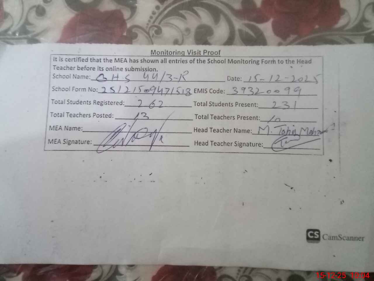| Attendance Register | Head Teacher | MEA with School | Visit Proof |