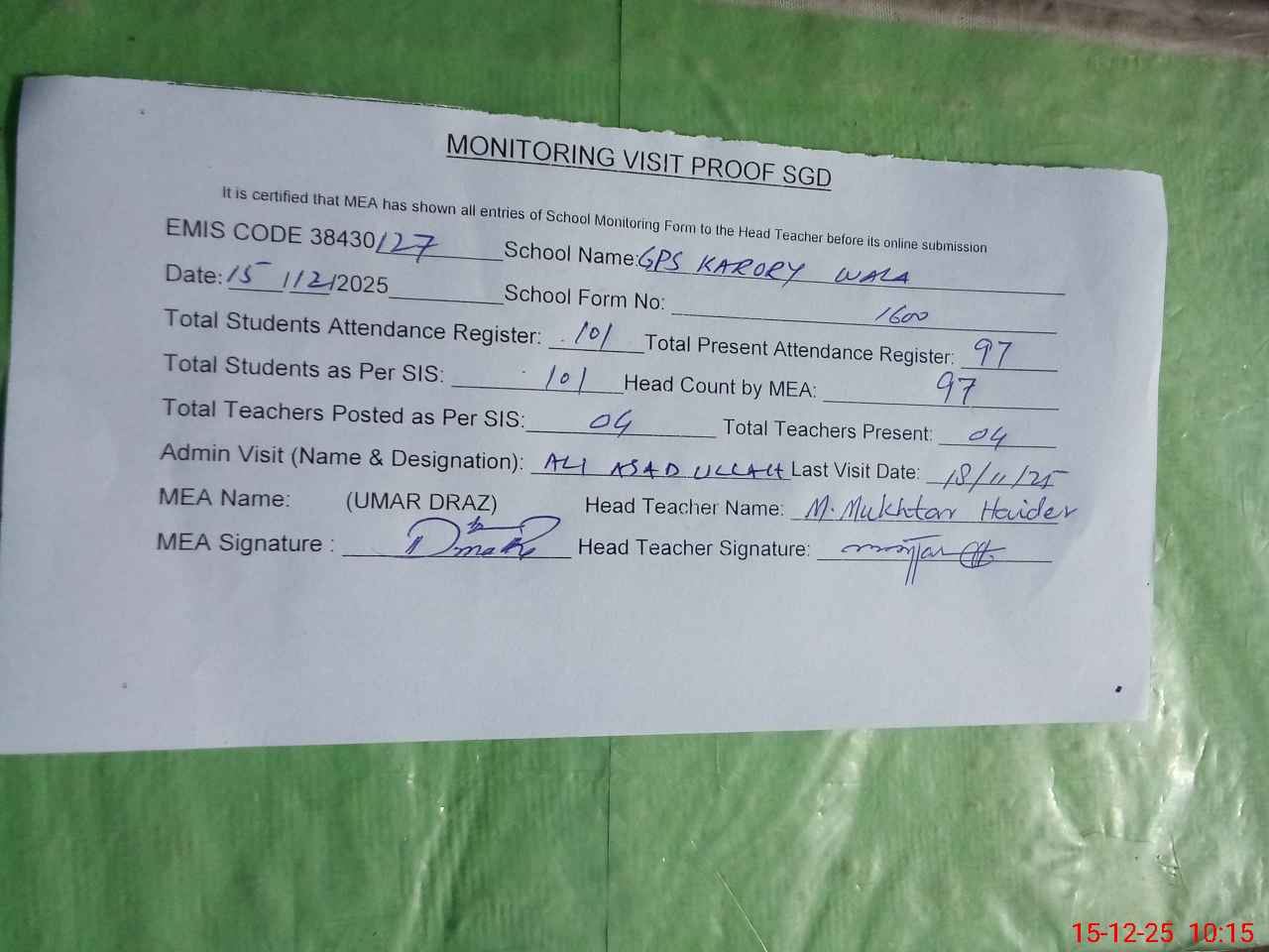 | Attendance Register | Head Teacher | MEA with School | Visit Proof |