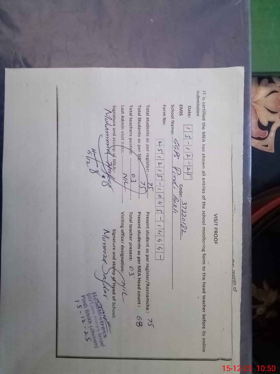 | Attendance Register | Head Teacher | MEA with School | Visit Proof |