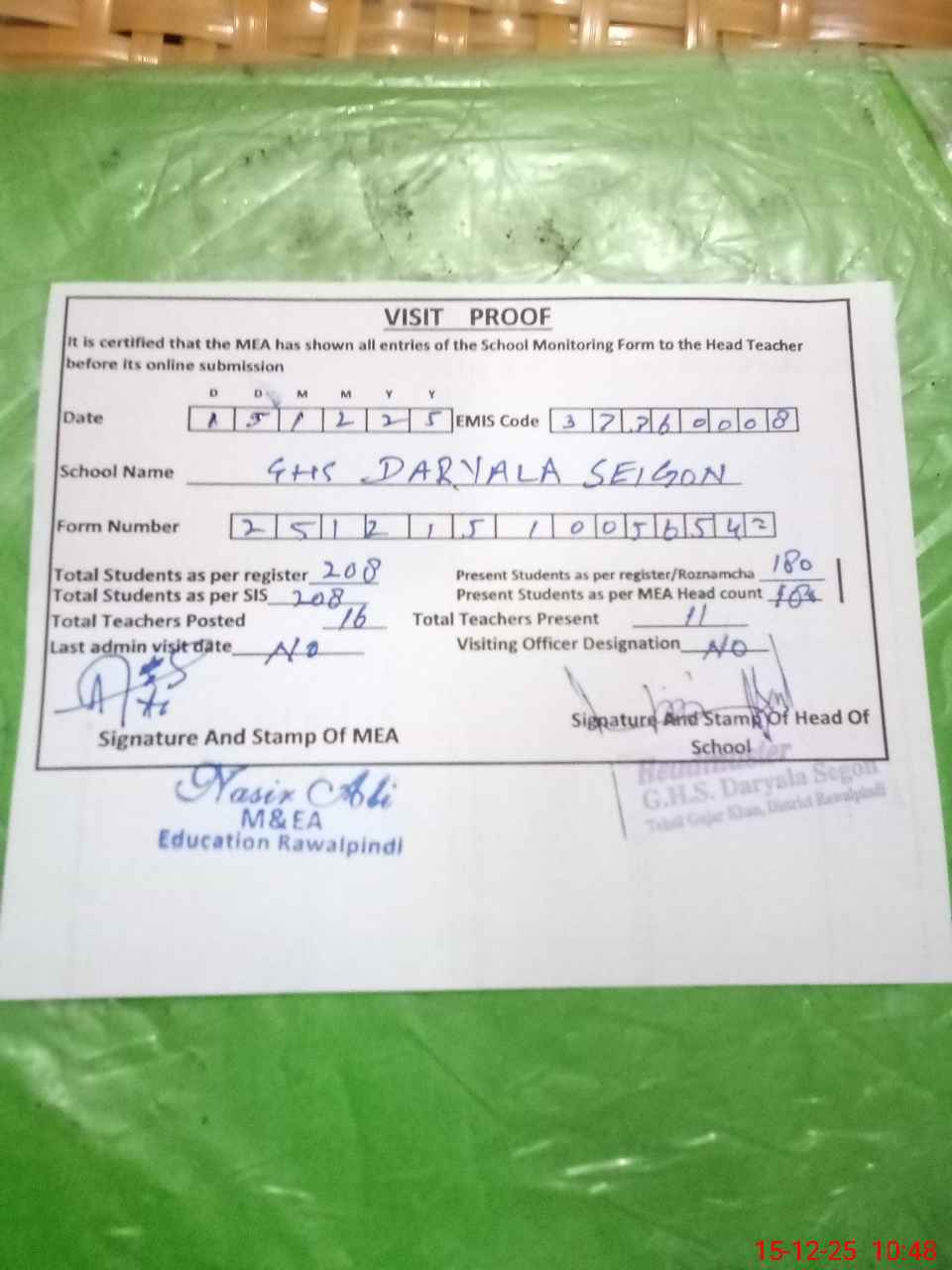 | Certified that this School was Inspected by the Undersigned MEA/DMO Today and the Information Stated Above is as Per Record. | |||||
