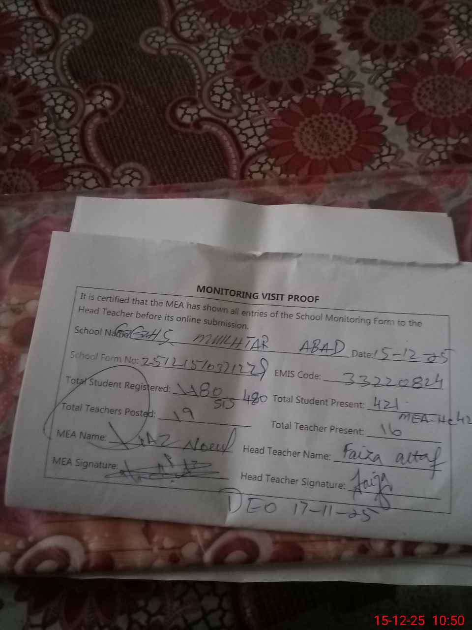| Certified that this School was Inspected by the Undersigned MEA/DMO Today and the Information Stated Above is as Per Record. | |||||