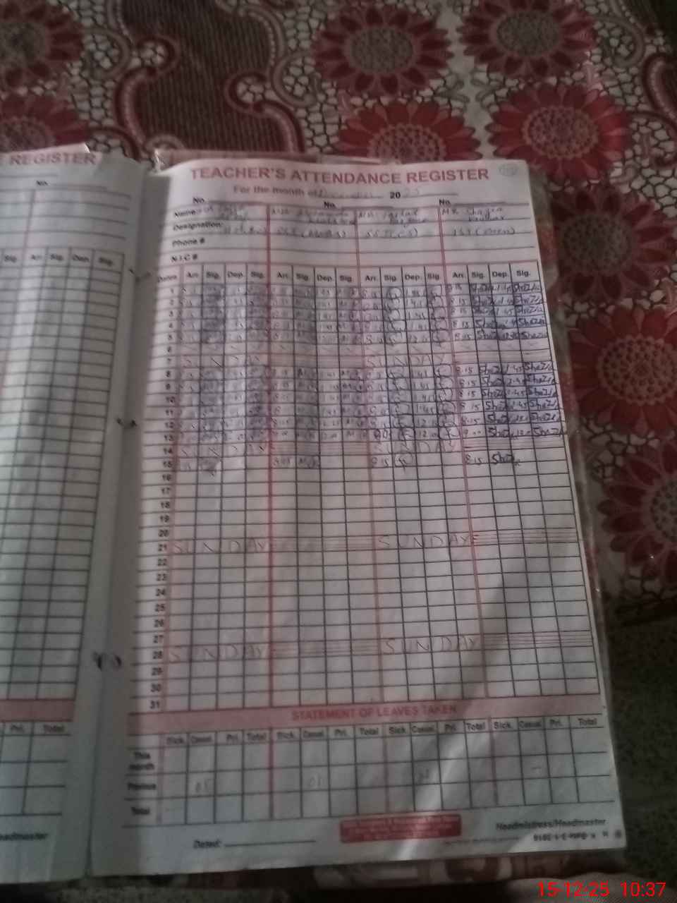 | CNIC | Full Name | Designation | R/C | Absence During Last Calender Month |