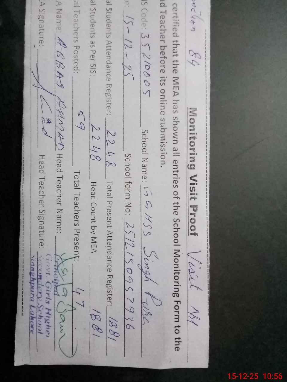 | Attendance Register | Head Teacher | MEA with School | Visit Proof |