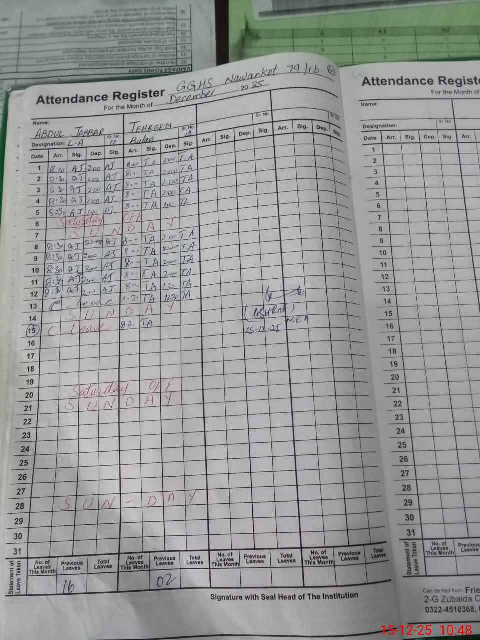 | CNIC | Full Name | Designation | R/C | Absence During Last Calender Month |