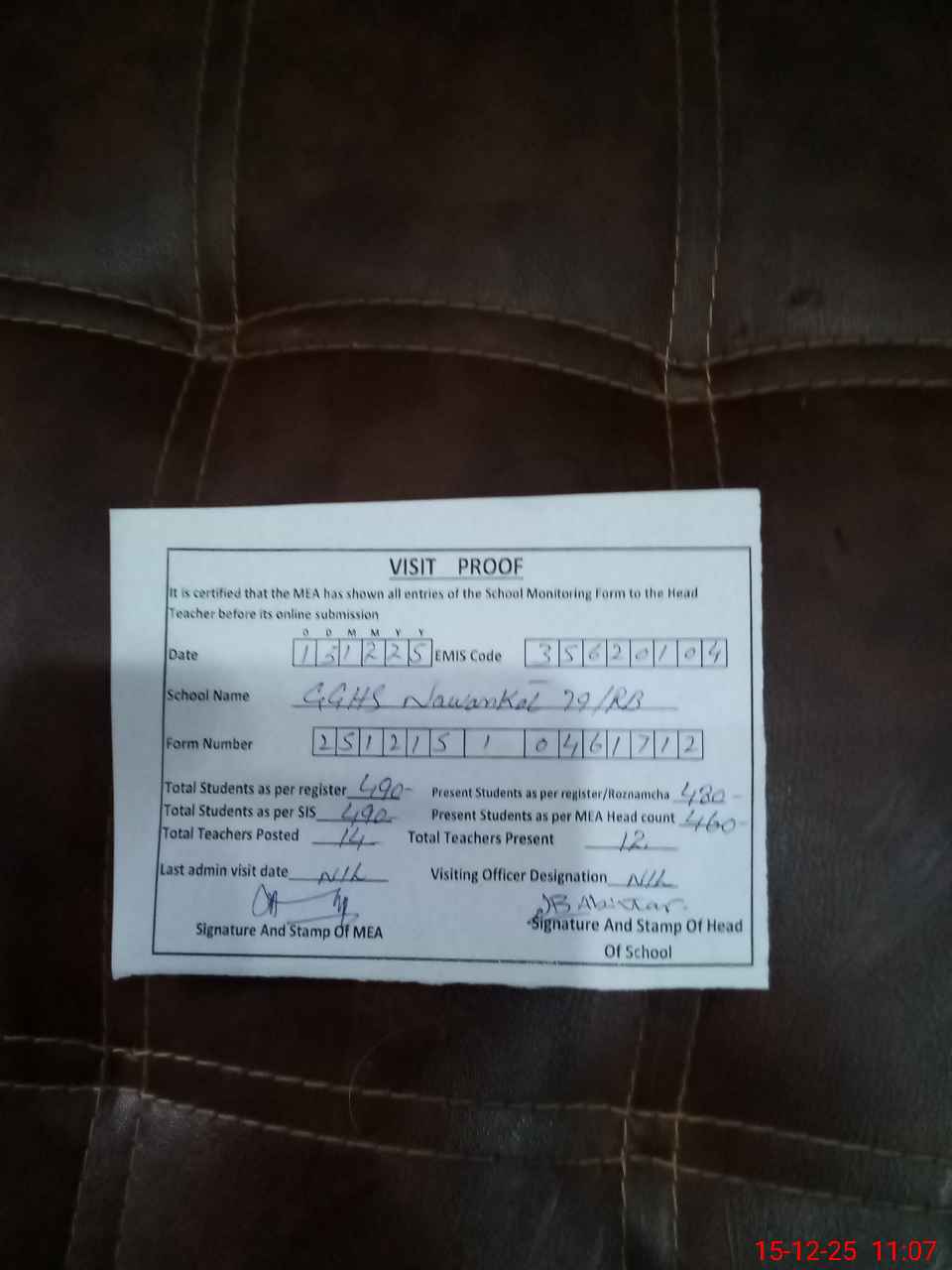 | Attendance Register | Head Teacher | MEA with School | Visit Proof |