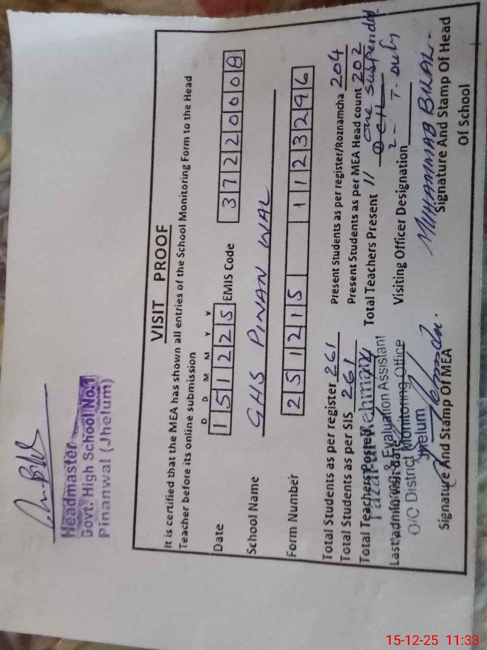 | EMIS Code: 37220008 | Name of School: GHS PINAN WAL No. 1 | |||
