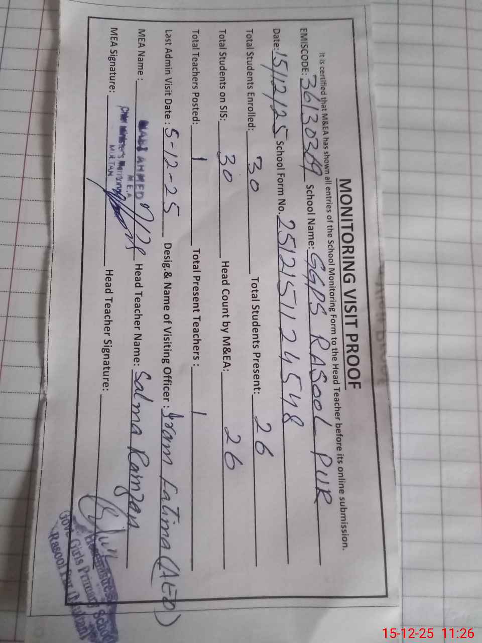 | EMIS Code: 36130369 | Name of School: GGPS RASOOL PUR P/O JHOK VENCE | |||
