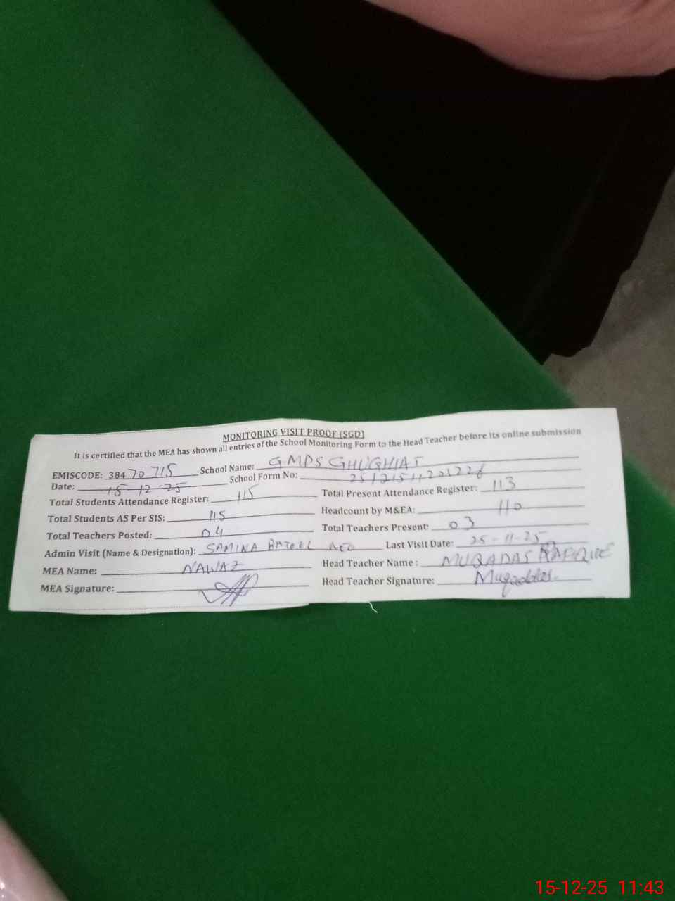 | Attendance Register | Head Teacher | MEA with School | Visit Proof |