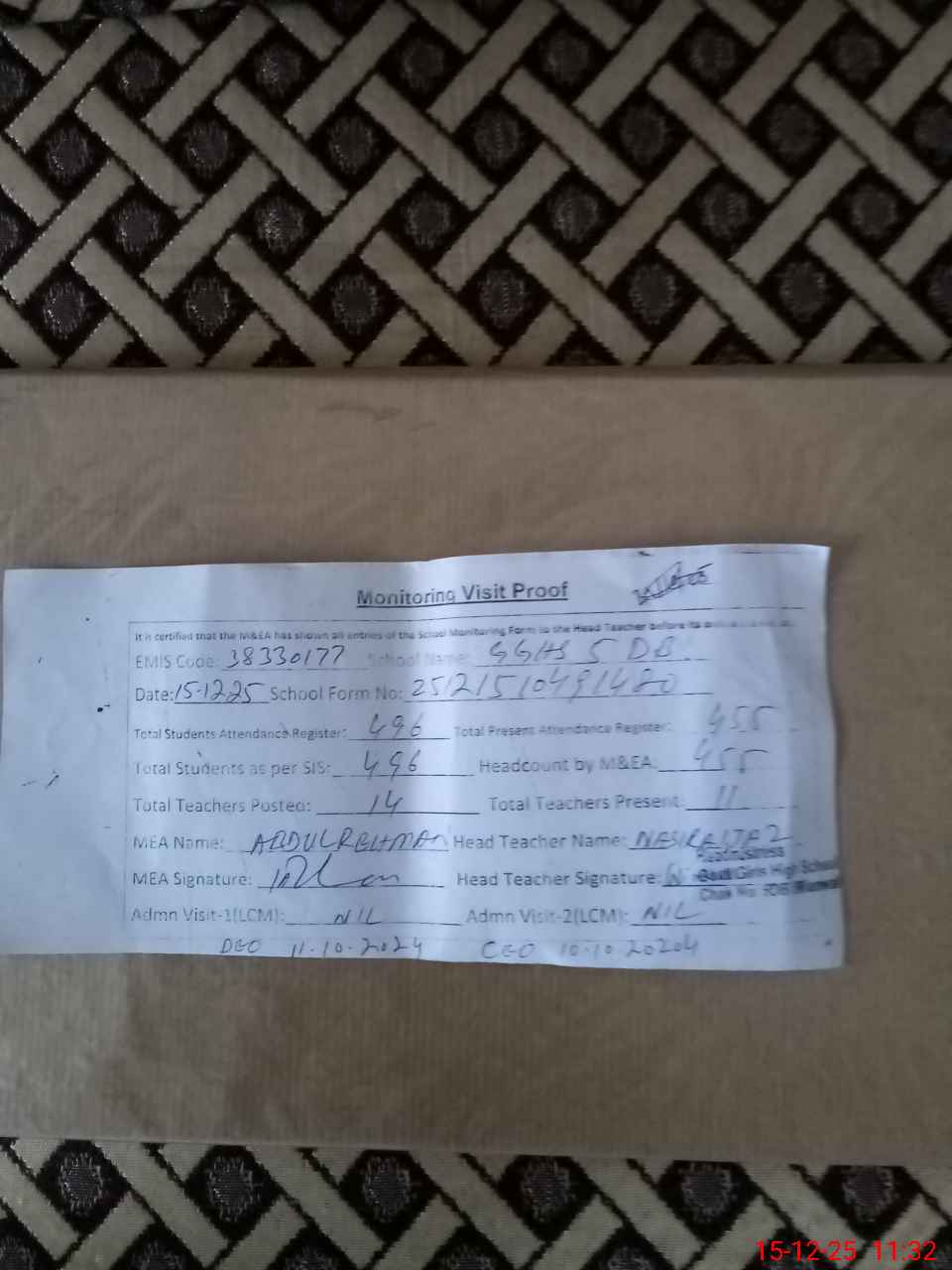 | Certified that this School was Inspected by the Undersigned MEA/DMO Today and the Information Stated Above is as Per Record. | |||||