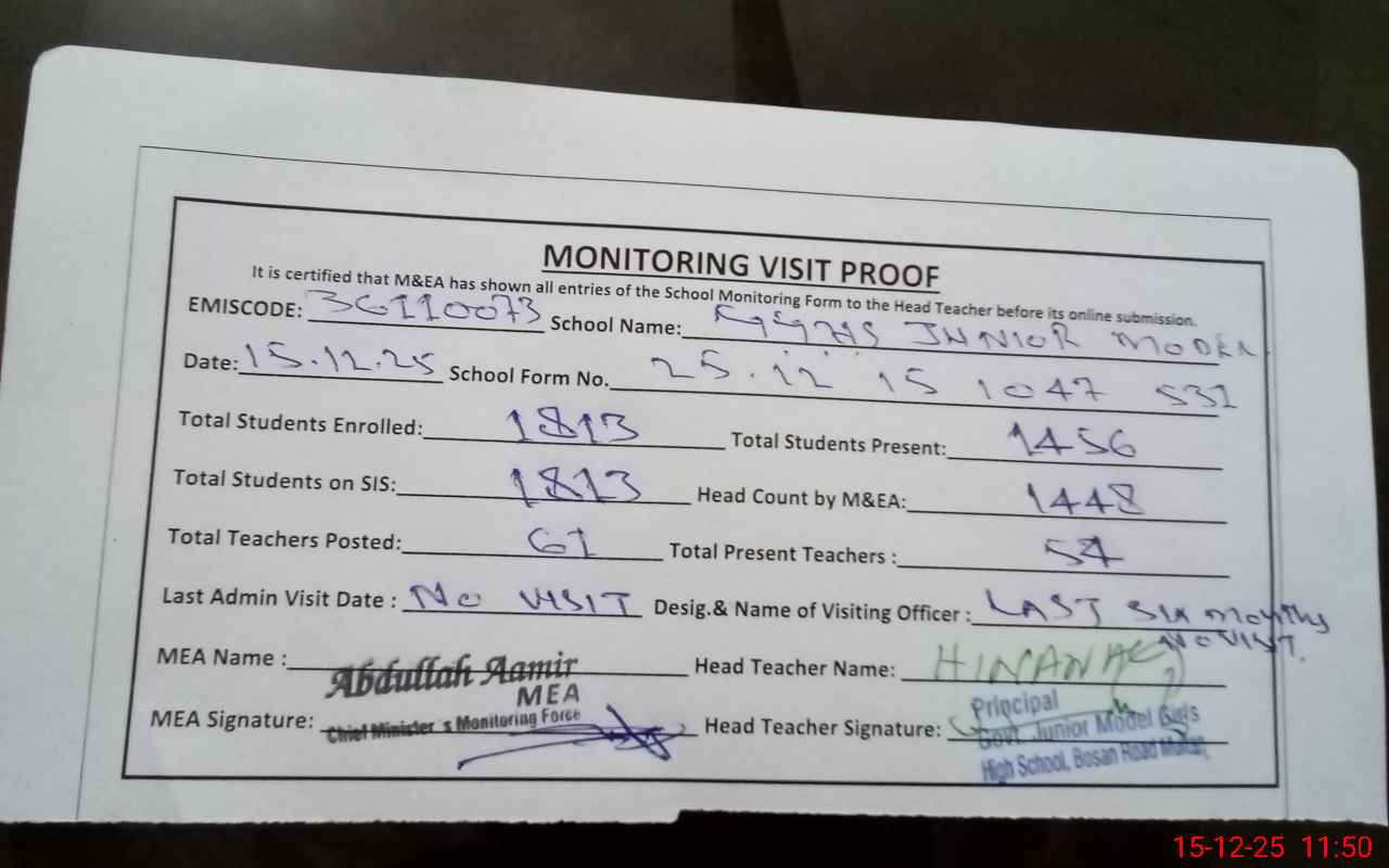 | EMIS Code: 36110073 | Name of School: GGHS JUNIOR MODEL CHUNGI NO. 6 BOSAN ROAD MULTAN | |||