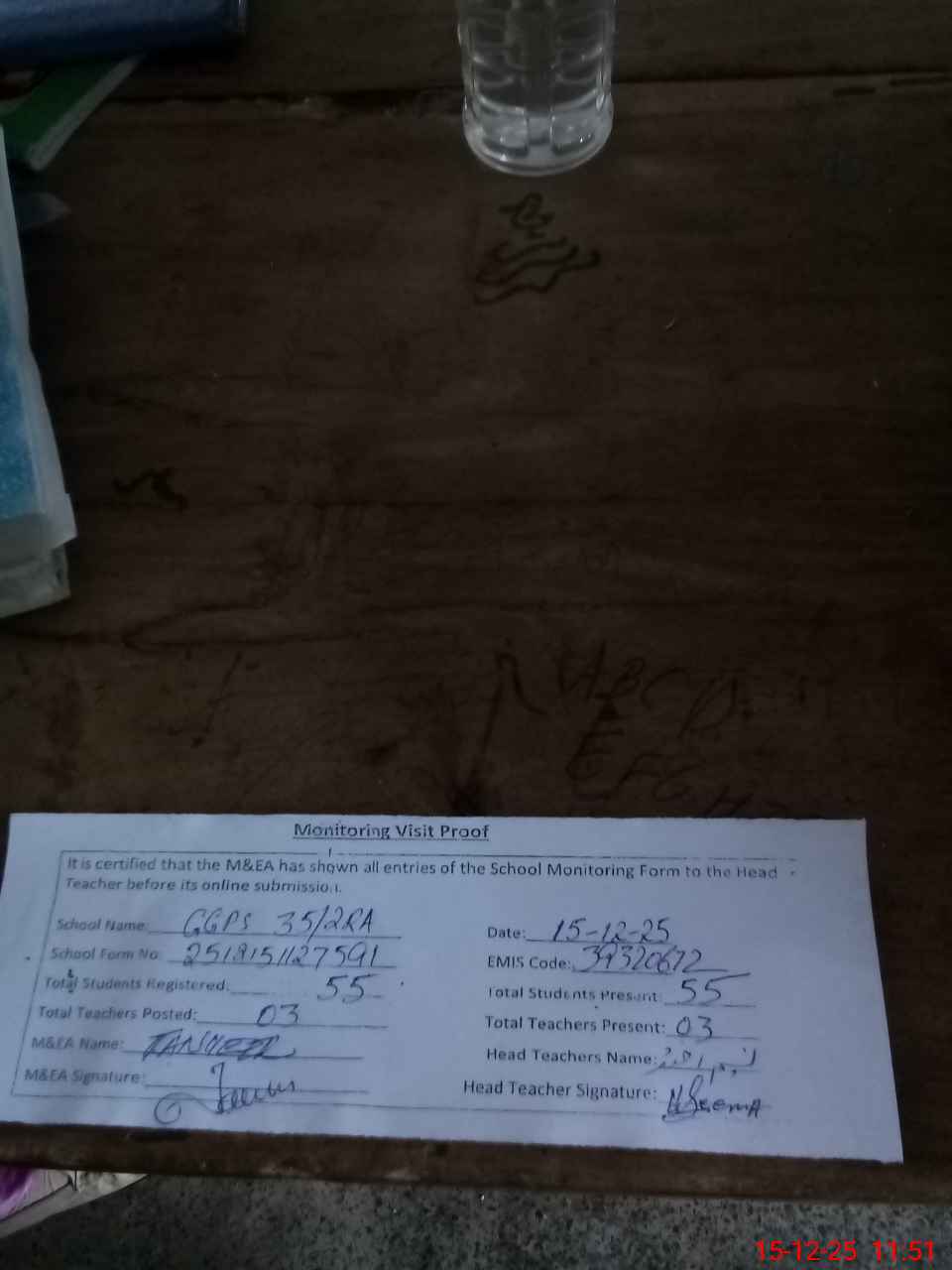 | Attendance Register | Head Teacher | MEA with School | Visit Proof |