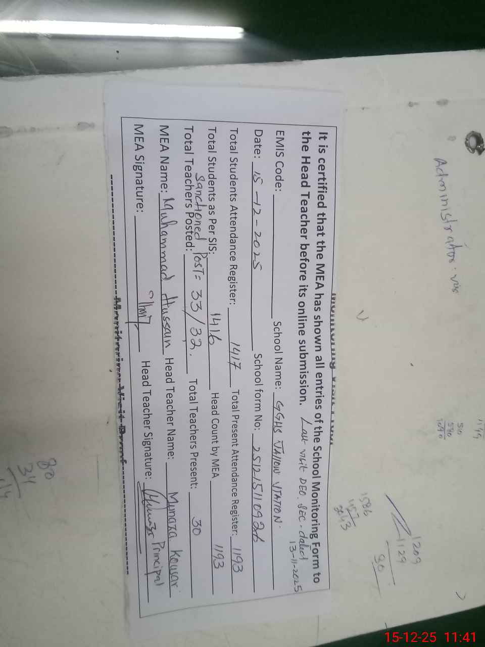 | Remarks (Use Separate Page if Required): 1 Three toilets non functional due to severage problem 2 School up graded to higher secondary school vide order no SO (SNE)LAHORE / 2023( SBC) dated 9-10-2025 3 Last administrative visit DEO SECONDRY dated 13-11-2025 | |||||