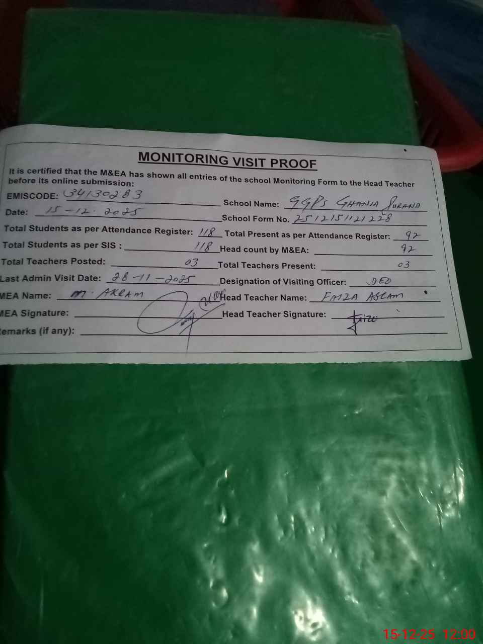 | Attendance Register | Head Teacher | MEA with School | Visit Proof |