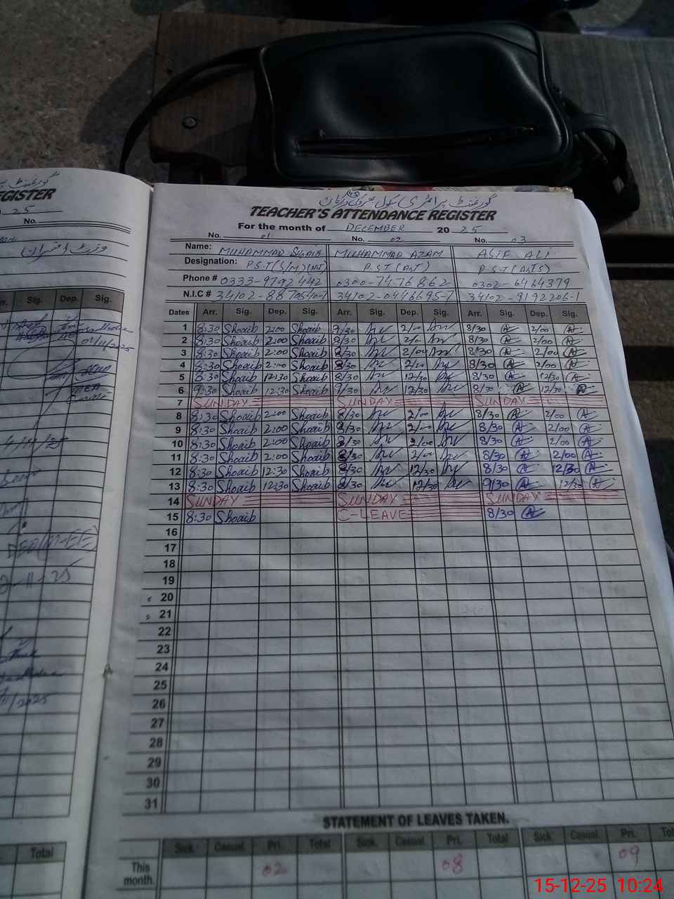 | CNIC | Full Name | Designation | R/C | Absence during last cal. month |