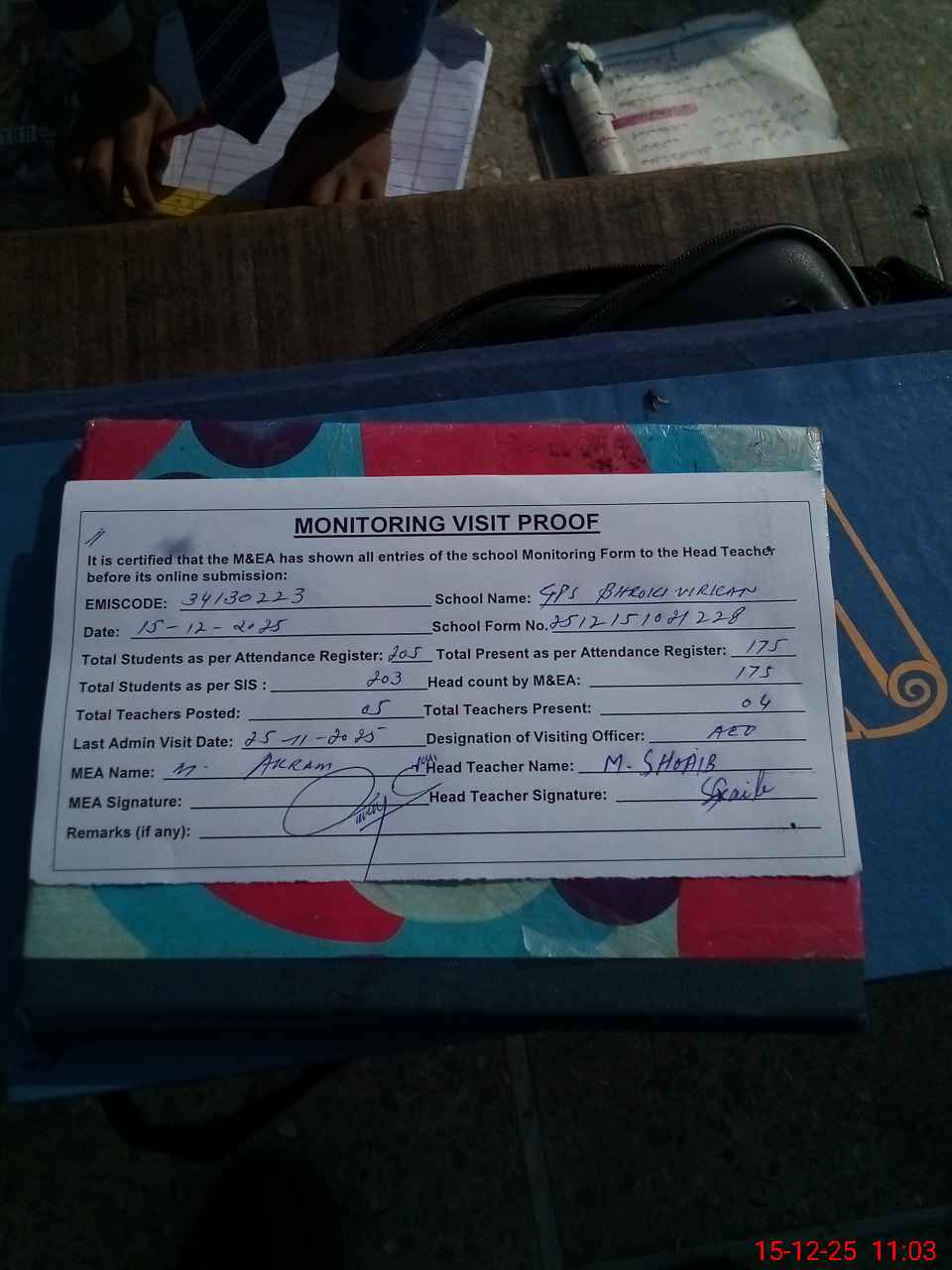 | Attendance Register | Head Teacher | MEA with School | Visit Proof |