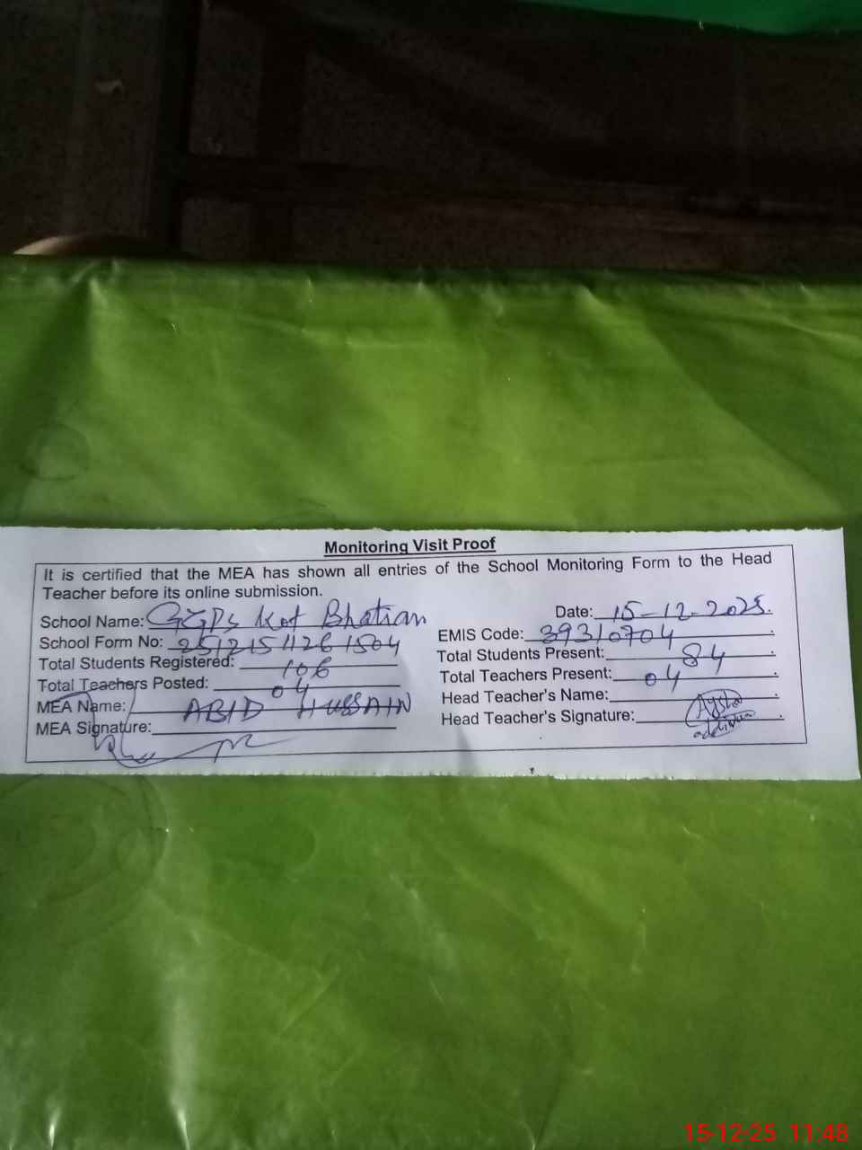 | EMIS Code: 39310704 | Name of School: GGPS KOT BHATIAN | |||