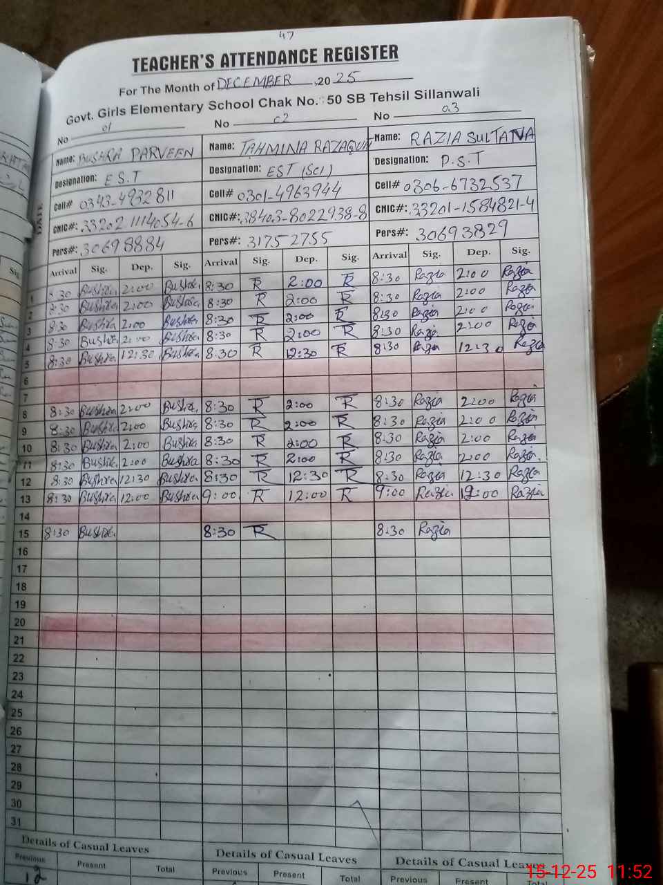 | CNIC | Full Name | Designation | R/C | Absence during last cal. month |