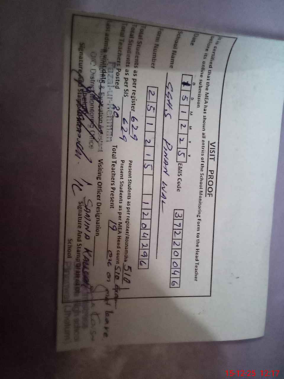 | Attendance Register | Head Teacher | MEA with School | Visit Proof |