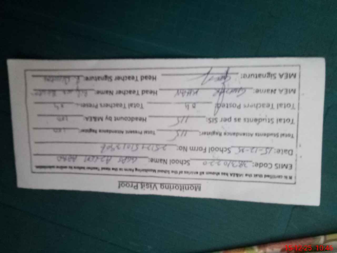 | Attendance Register | Head Teacher | MEA with School | Visit Proof |