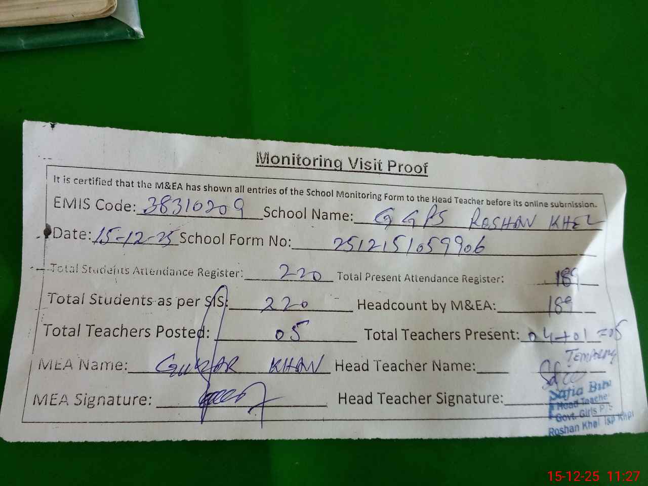 | Attendance Register | Head Teacher | MEA with School | Visit Proof |